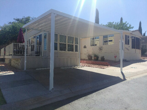 Awnings are those structures added to cover the porch or parking area of a mobile home. They are often built from a different type of material than Patio Covers or Pergolas. Awnings have different shaped pans than the normal Flat Pan system, and are not usually as clean of a look as the regular Alumawood Patio Cover.